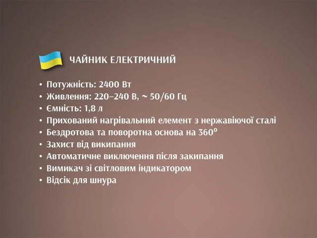Компактний електричний чайник ємністю 1,8 літра та потужністю 2400 Вт має автоматичне вимкнення при скипанні води.