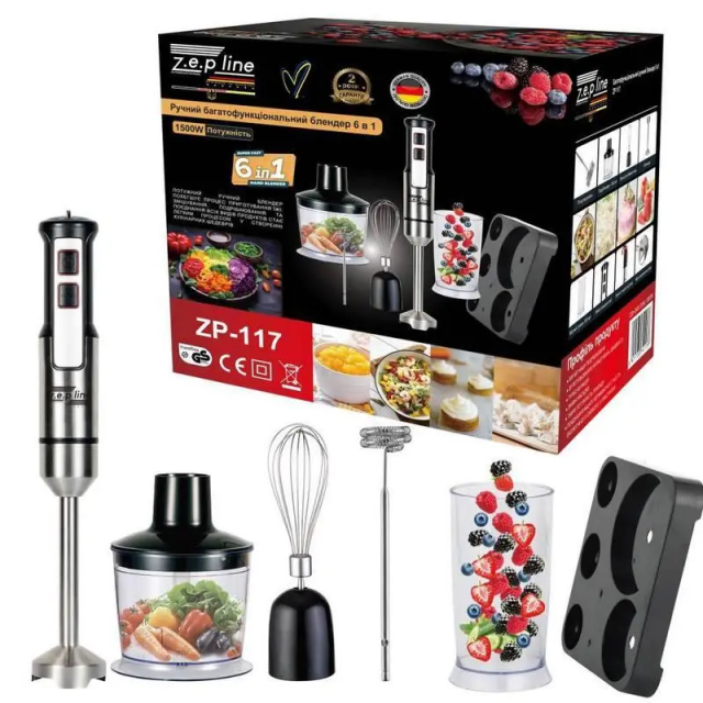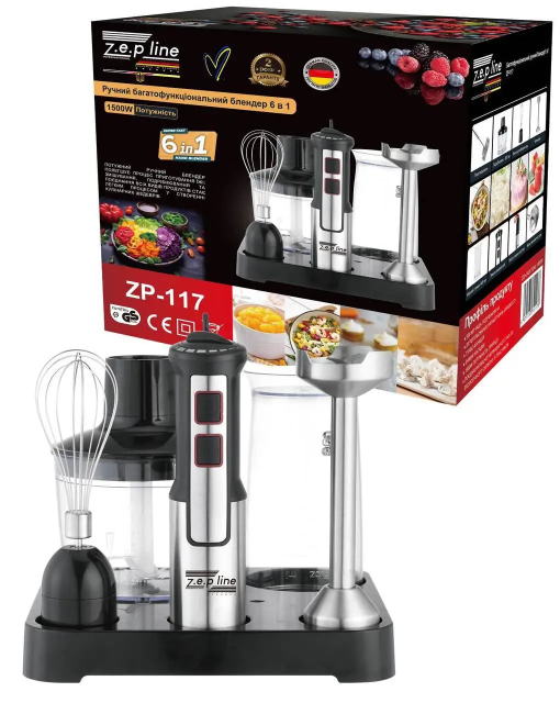 Блендер занурювальний з чашею та насадками на підставці 6в1. Багатофункціональний блендер подрібнювач 1500 Вт.
