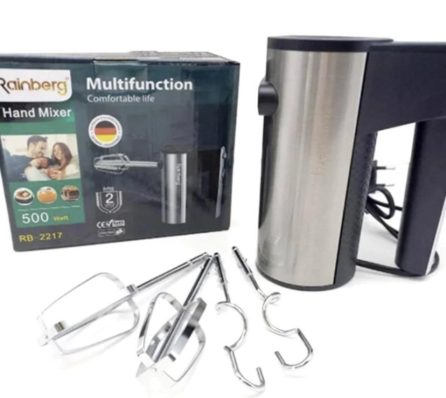 За допомогою ручного міксера Rainberg RB-2217 Ви з легкістю потішите всю Вашу родину – замісите тісто, приготуйте смачні соуси або зб'єте яйця. Отримати суміші різної консистенції ви зможете завдяки 5-ти швидкісним режимам. Повітряне чи густіше тісто вам допоможуть замісити дві насадки для тіста. А два віночки для збивання дозволять швидко та якісно збити потрібний вам продукт. Міксер Rainberg RB-2217 – прилад дуже зручний та легкий у використанні та очищенні.