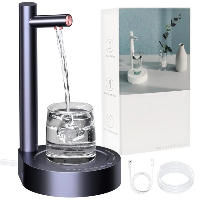 Для швидкого наповнення водою ємності з громіздкої пляшки 18.9 л використовують електричну помпу. При першому натисканні кнопки вода плавно заповнює склянку, чайник. При другому натисканні припиняє текти в посуд. Безпечна у використанні помпа приваблює незвичайним дизайном. Виконана у вигляді підставки, яка надійно витримує вагу наповненої водою тари.